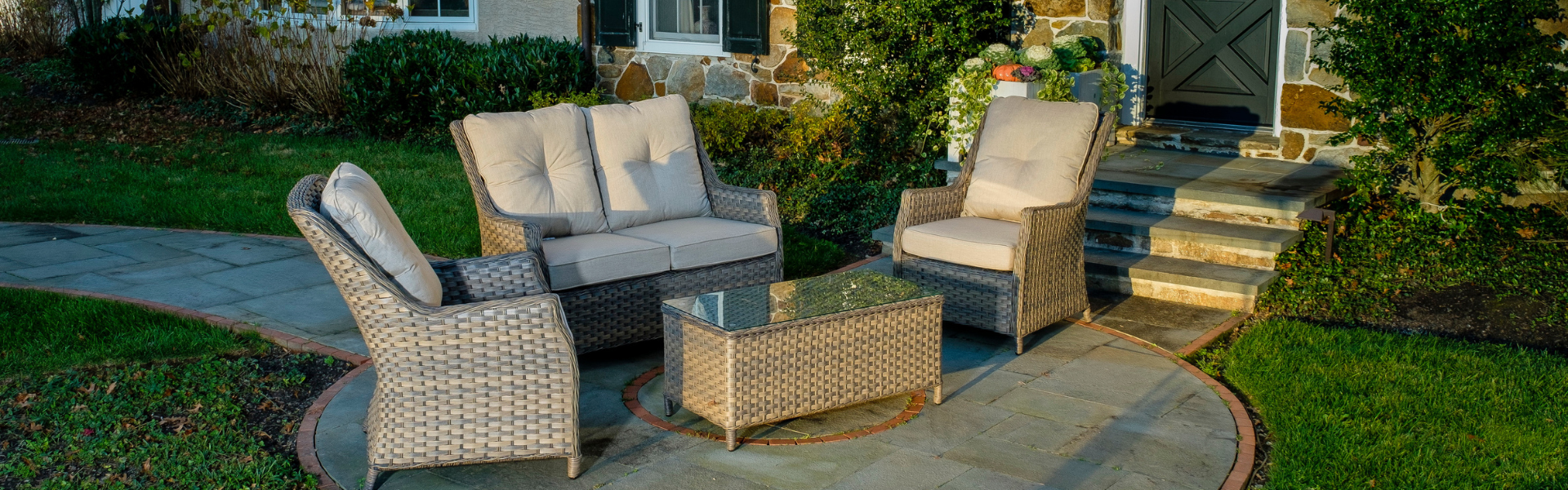 • Alfresco Home Castlewood All Weather Wicker 4 Piece Seating Group with Cushions - 353-3002 FEATURES 4 pc set includes love seat, 2 lounge chairs and a...