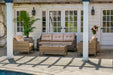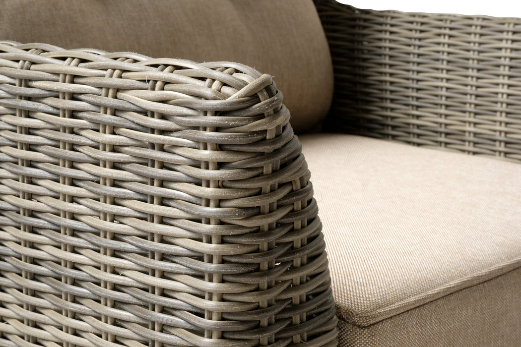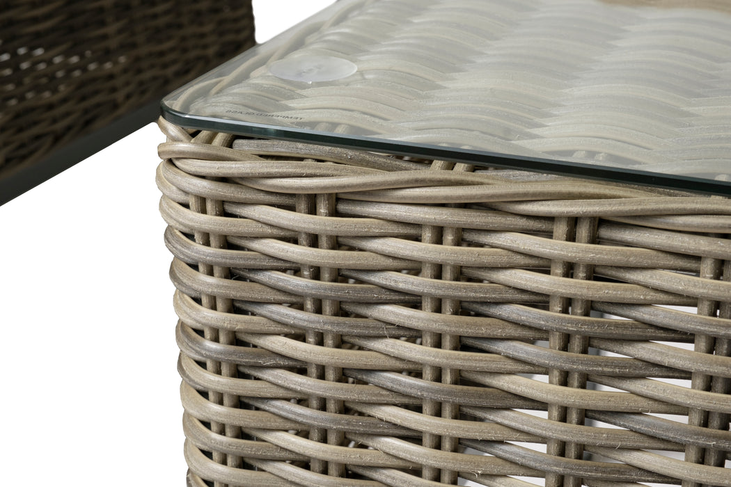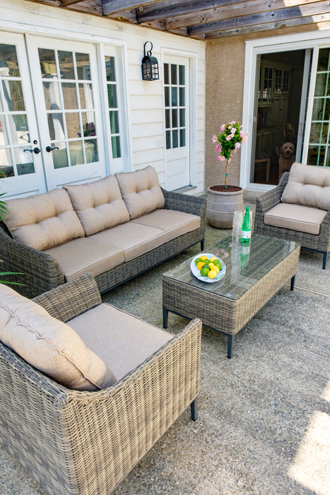 This 4-piece sofa seating group's cushions are wrapped in durable Sunbelievable fabric that's UV- and water-resistant. Built on an inner aluminum frame, this set is UV-, rust-, and water-resistant, so it can withstand the elements. The frames are wrapped in resin wicker offering a cozy feel. Completing the set is a glass-topped coffee table where you can place a tray of snacks and drinks on for hosting.