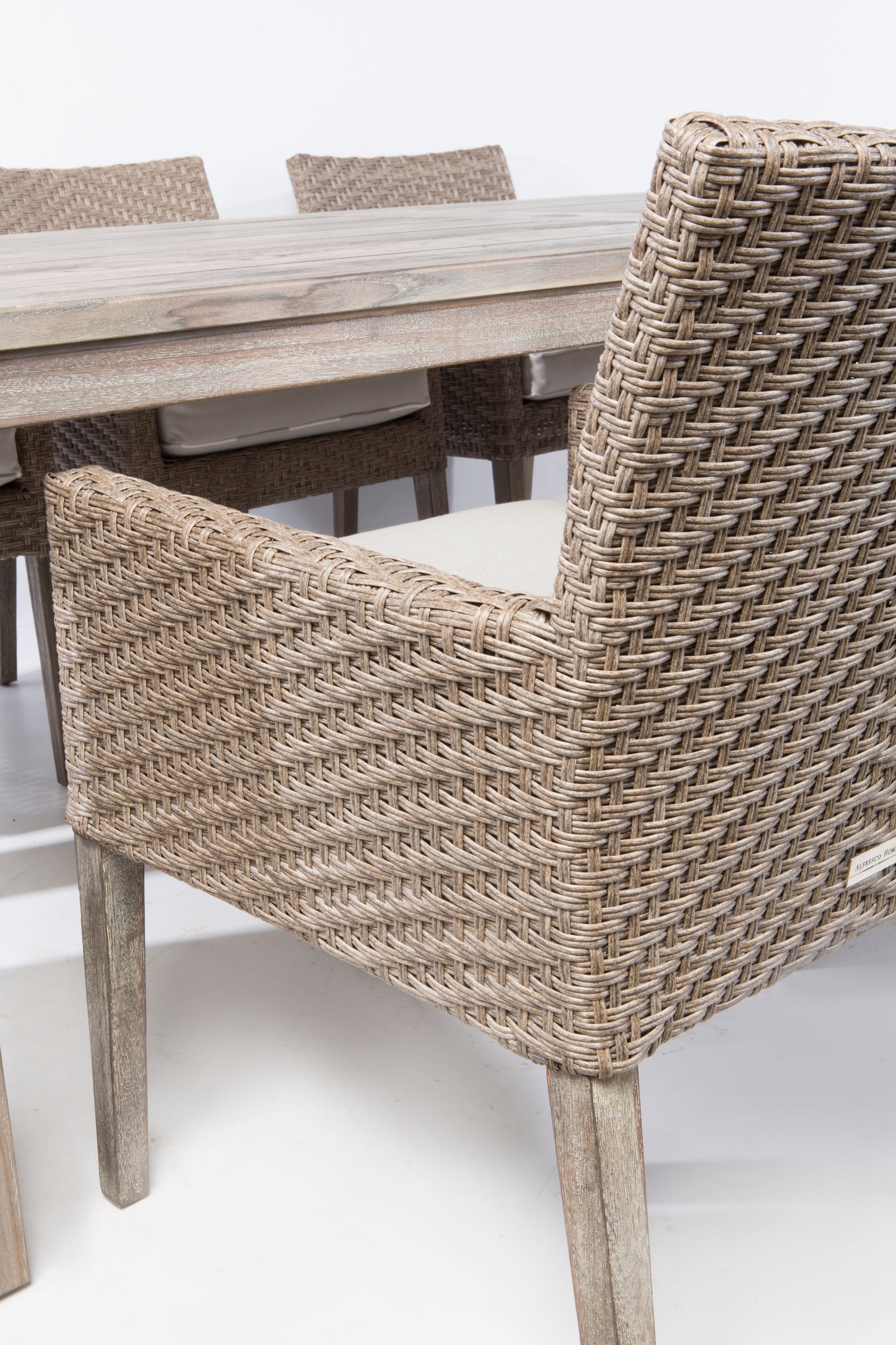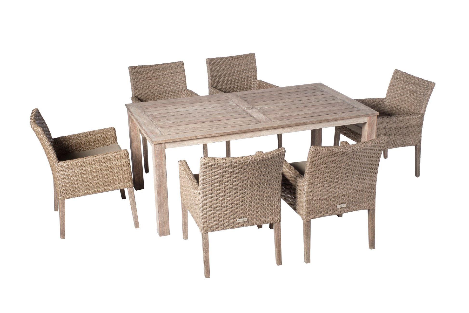 Alfresco Home Cornwall Wooden Dining Table with Umbrella Hole and 6 Dining Arm Chairs with Sunbelievable Cushions - 46-3002