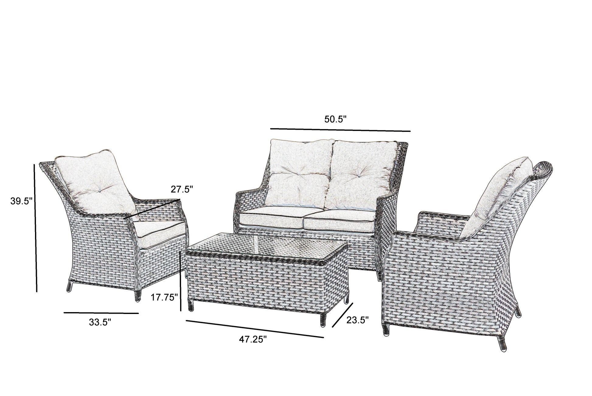 - 4 pc set includes love seat, 2 lounge chairs and a coffee table