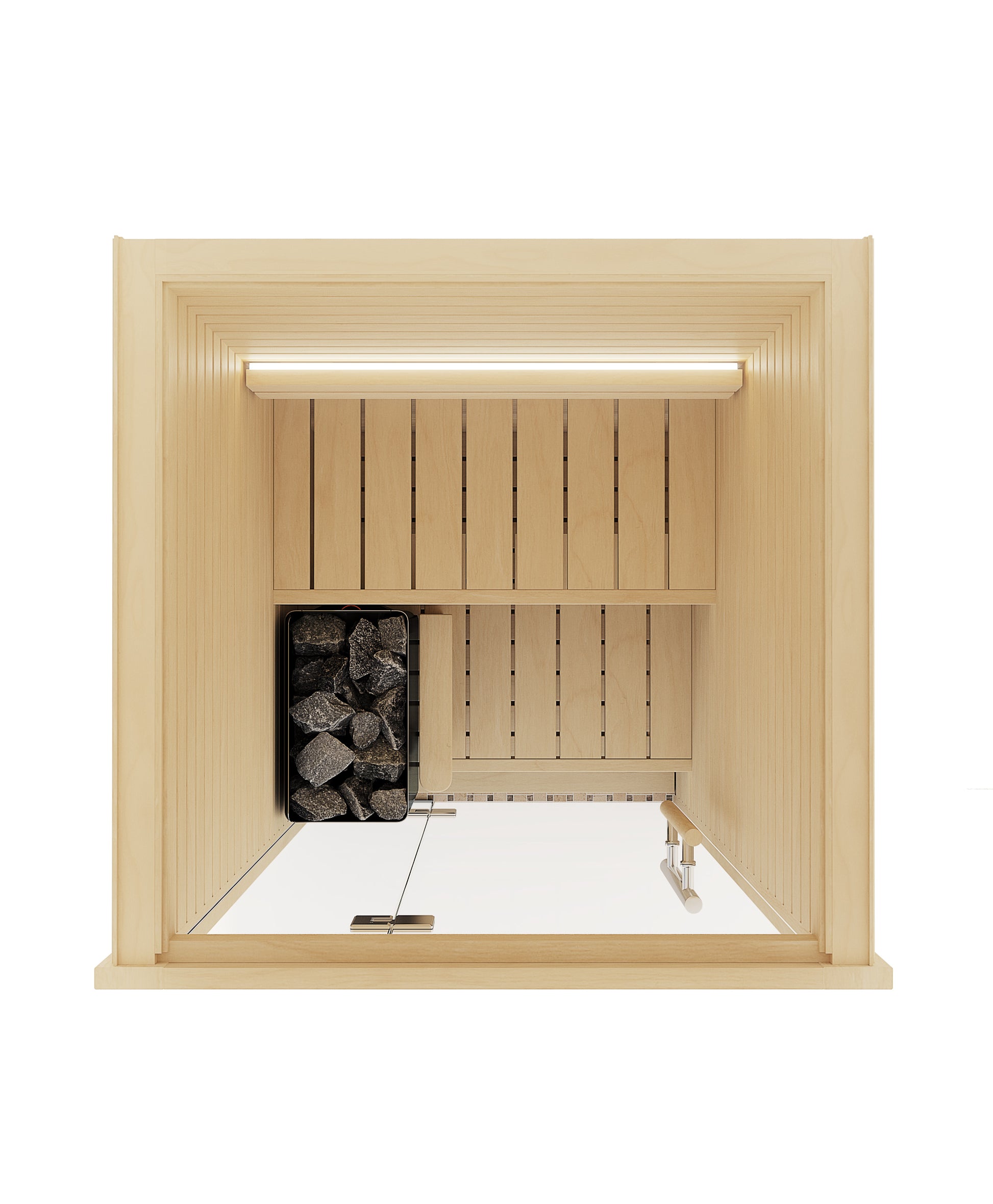 The Cala Mini is a 1-person home sauna kit made from northern European aspen wood. This premium-quality sauna features a full-glass front and 2-tier seating for a more comfortable and satisfying bathing experience. With its silky-smooth texture, elegant light tone, and no visible fasteners, this compact sauna showcases the impeccable attention to detail of a custom-built sauna.
