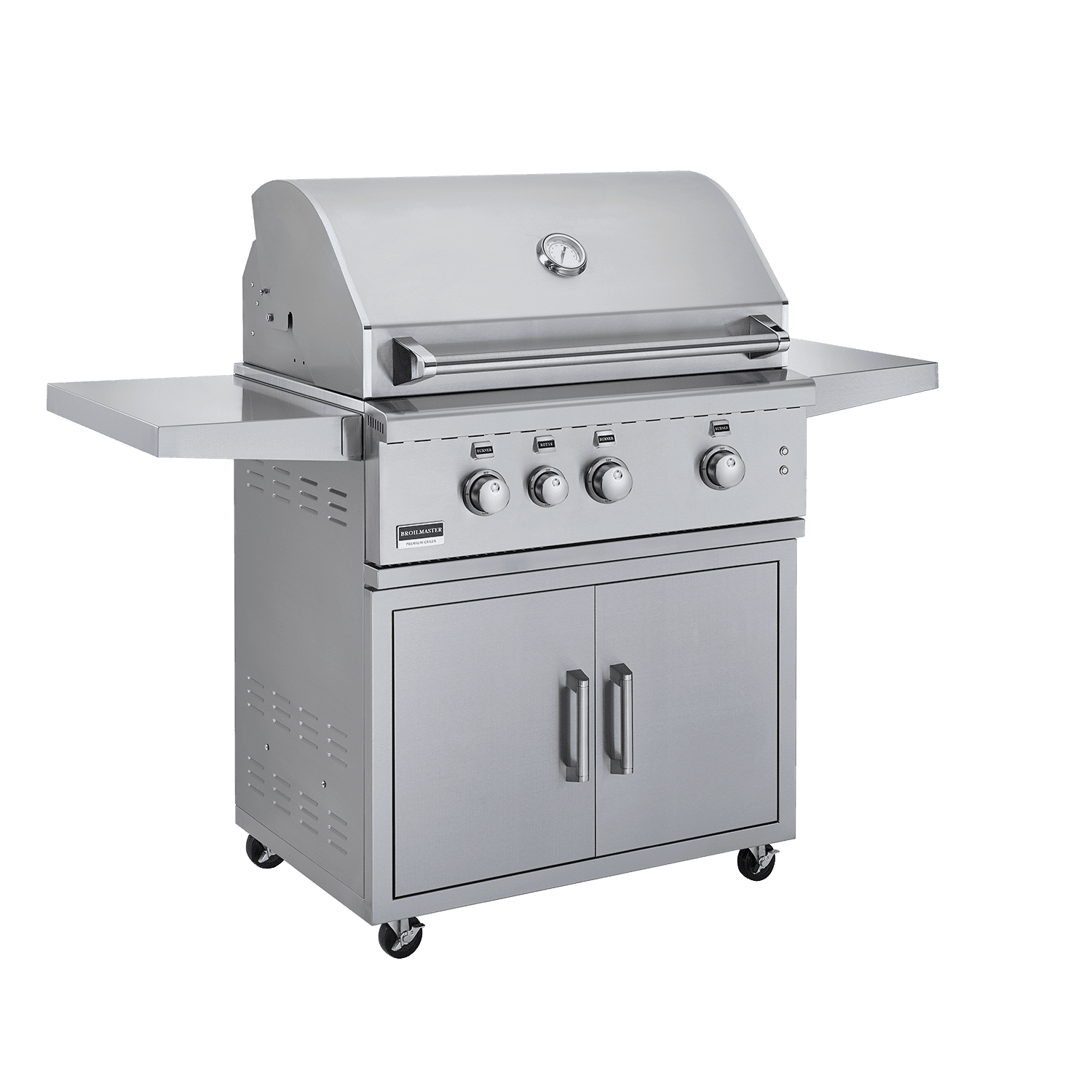 The Broilmaster G Series Stainless gas grill comes fully loaded with a variety of standard features, offering both convenience and versatility. Three Bow Tie burners (18,000 BTUs each) and up to 806 square inches of total cooking area provide a variety of cooking options for a smaller crowd. If you’re dreaming of the perfect built-in island kitchen, you can customize this grill with a wide range of optional doors, drawers, side burners, and accessories. Or, move your grill almost anywhere with a matching stainless steel cart. The optional cart features two doors for easy storage and two fold down side shelves for the perfect standalone grill.