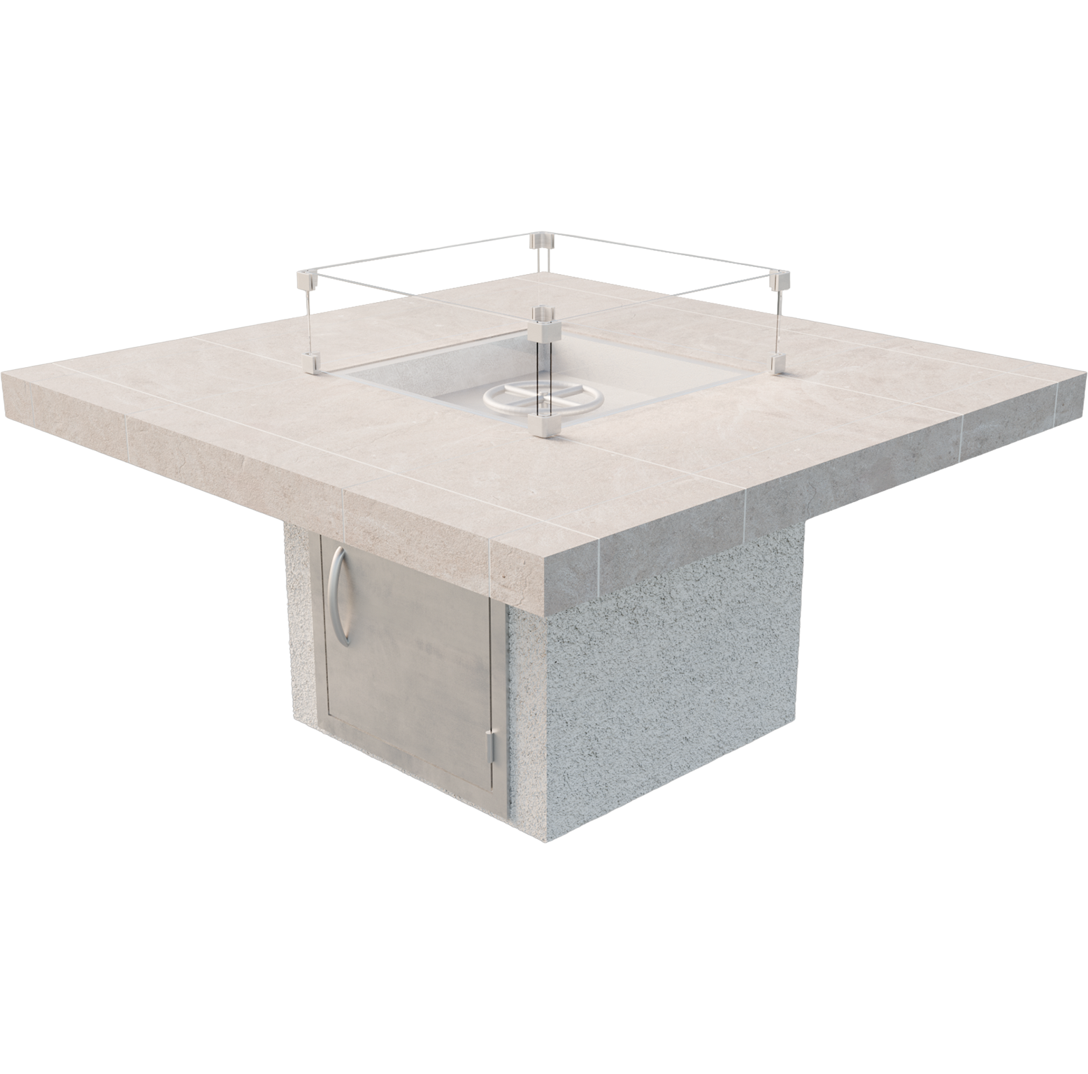 The Sedona's broad square surface offers generous space for drinks, décor, or cozy gatherings around the fire, while the included glass wind guard adds a sleek, contemporary touch that enhances both form and function. At the heart of the fire pit, a powerful burner delivers up to 90,000 BTUs of mesmerizing flame—perfect for everything from lively evenings with friends to quiet nights unwinding under the stars.