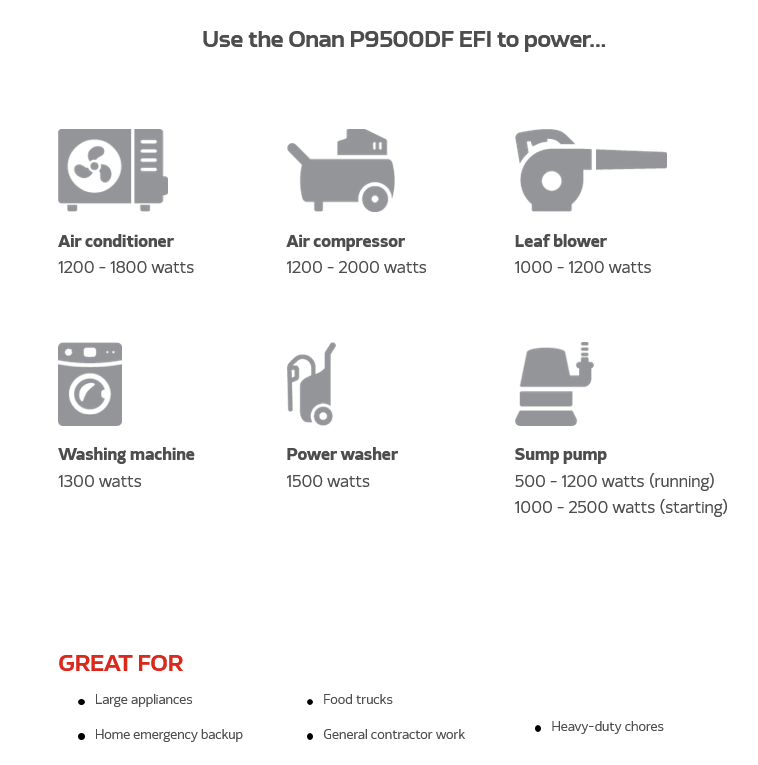 • Fuel efficient - 6.6 gallon fuel tank that runs 14.4 hours at 25% load on gasoline, 10.8 hours on a 20 lb. propane tank