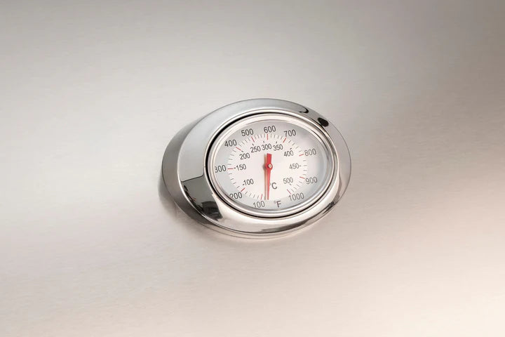 Analog Thermometer with polished stainless steel bezel is embedded in the hood. It is large and attractive with a forward angle for easy viewing.