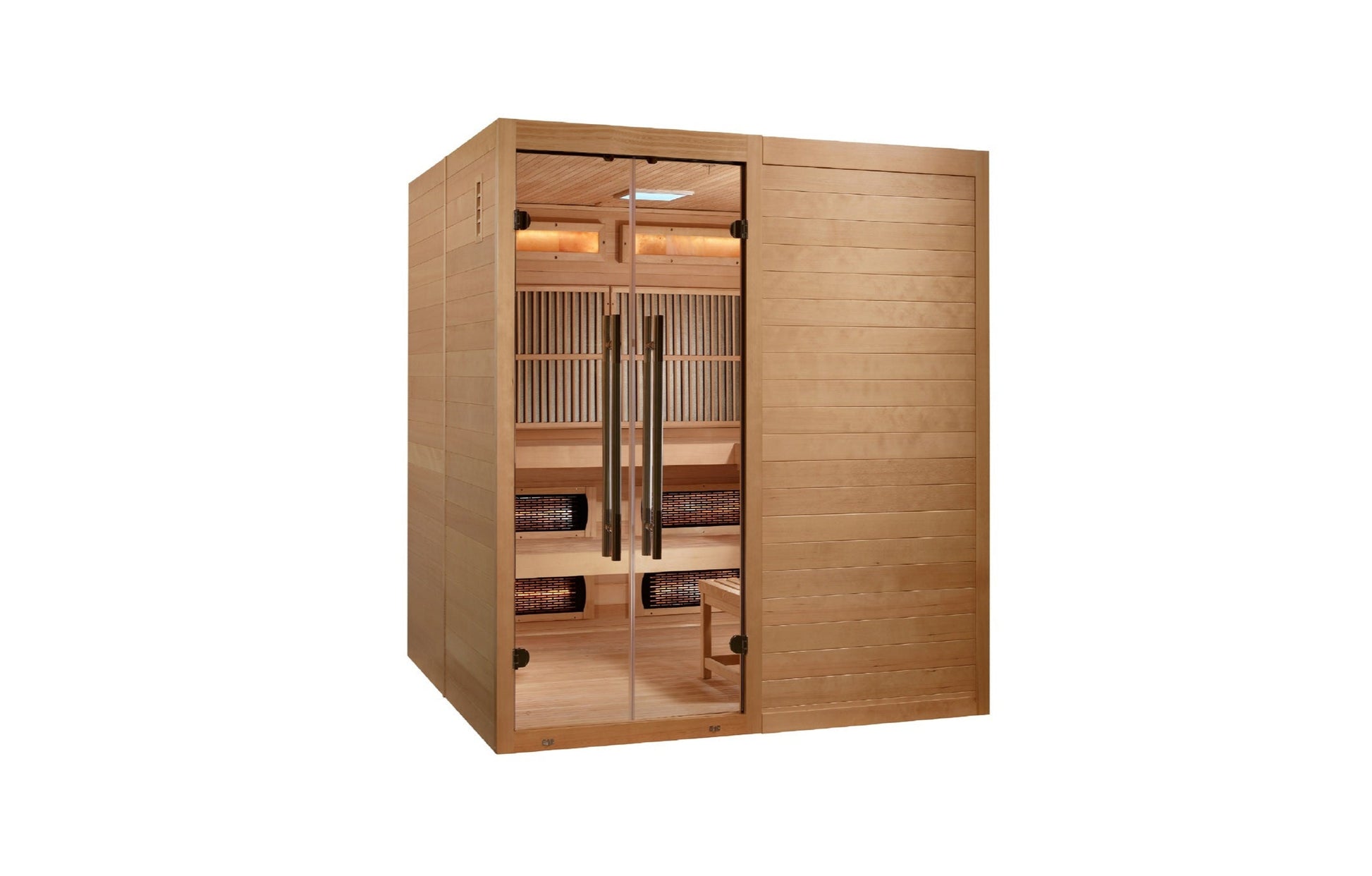 Golden Designs is proud to offer the Toledo Indoor Hybrid Sauna, featuring our PureTech™ Full Spectrum Infrared Technology and a Harvia Traditional Stove heating option. (Infrared and Stove do not operate simultaneously.) When the benches are removed, the sauna transforms into a yoga or stretching studio.