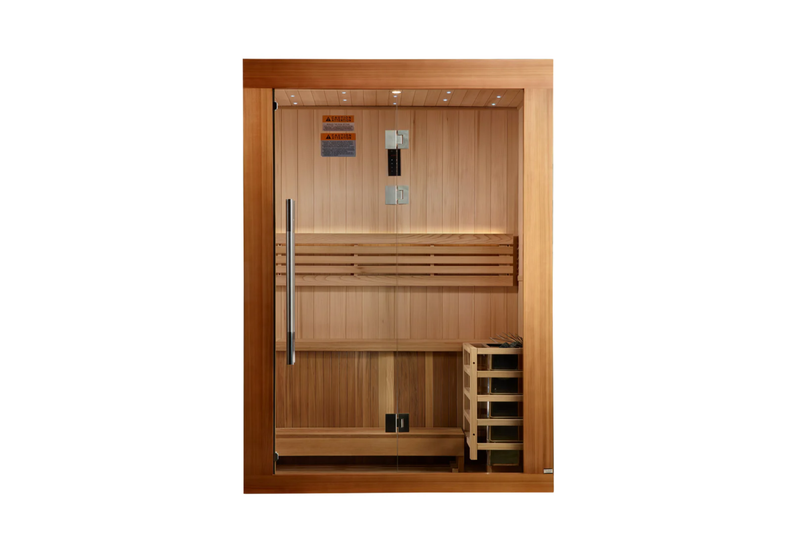With a Golden Designs traditional sauna, you can turn the dream of your own home spa into reality. The Updated Sundsvall 2-Person Traditional Sauna is designed to fit compact spaces while delivering an authentic, invigorating sauna experience—perfect for bathrooms, bedrooms, hotel suites, or dedicated wellness rooms.