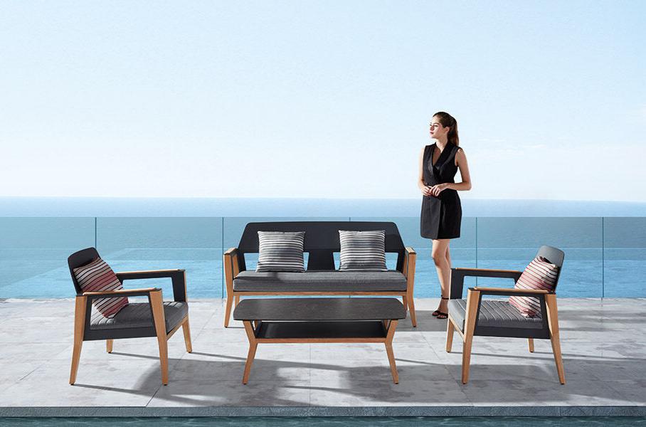 Designed by Nicolas Thomkins, the HiGold Sheldon collection is a sophisticated blend of mid-century inspiration and modern craftsmanship. This elegant loveseat features sculpted solid teak legs that seamlessly integrate into the aluminum frame, offering a warm and natural contrast to the sleek design. Perfect for both contemporary and transitional spaces, the Sheldon loveseat brings refined character and enduring comfort to any outdoor setting.
