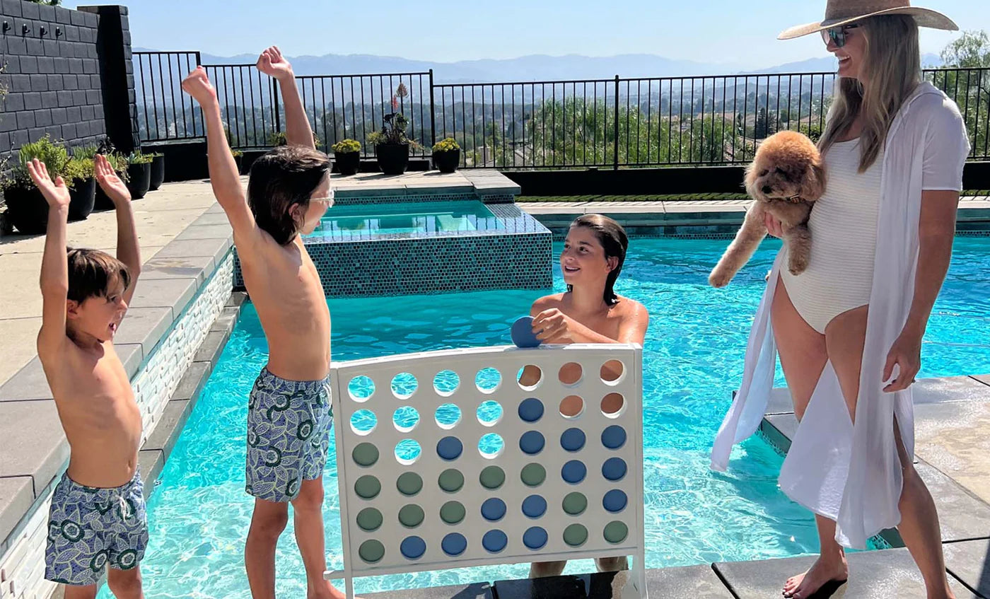 Four in a Row offers oversized outdoor fun for all your friends and family. It features a giant white all-weather board and two sets of large colored chips in sage green and sky blue.