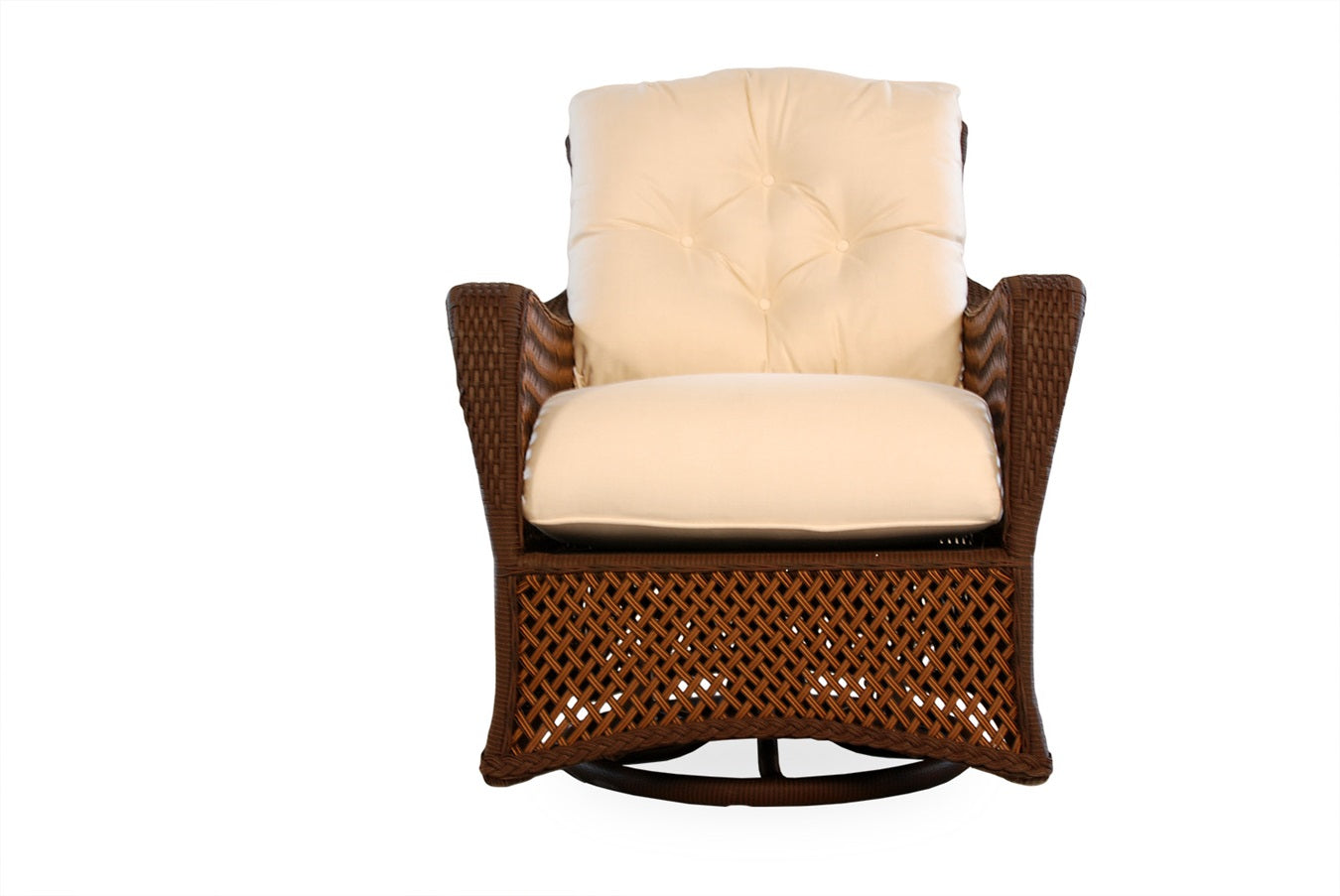 Featuring exclusive SunLoom vinyl in caramel or bisque, the Grand Traverse Swivel Glider Lounge Chair offers an extensive assortment of seating and dining options that will withstand the test of time. Waterfall cushions and open-weave vinyl elevate a classic traditional frame and add a special touch. Lloyd Flanders vinyl furniture is 100% virgin vinyl with UV inhibitors and has no added fillers to ensure that the vinyl will remain soft and pliable through many years of use and will hold its shape. Seat cushions are made with a core of foam for structure and longevity, wrapped with polyester layered fill for plush comfort and completely encased in a moisture resistant fabric for low maintenance in outdoor settings.