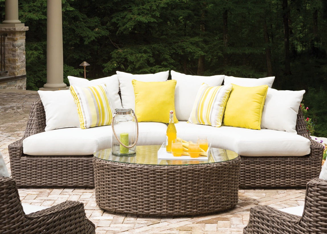 - Seat cushions are made with a core of foam for structure and longevity, wrapped with polyester layered fill for plush comfort and completely encased in a moisture resistant fabric for low maintenance in outdoor settings.
