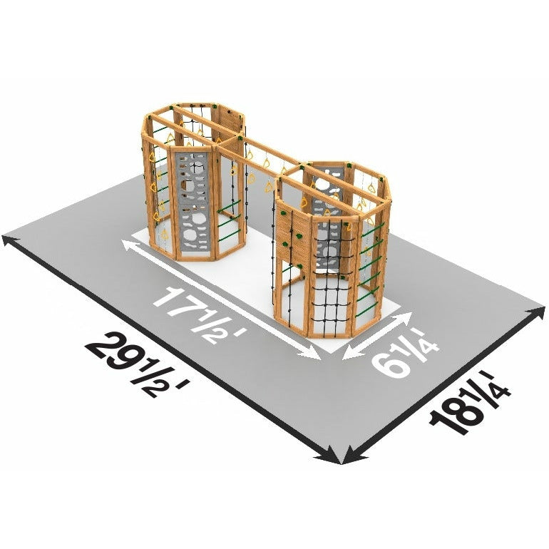 The Cliffhanger Gold Play Set includes the Cliffhanger kit, 2 Cargo Nets, 4 sets Climbing Rungs, 2 Climbing Rope Walls, 2 Rock Walls, 2 Hanging Rings on Chains, Monkey Rings, 4 Vertical Climbers, 2 Climbing Rope/Rock Walls and more Monkey Rings spanning between the two units