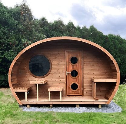 The shrouded front terrace offers a table and benches for relaxing before or after your sauna. A second table on the terrace provides wood storage below for those who elect to use a wood-fired sauna stove. Large round windows on the door and wall allow natural light in, along with a rectangular window on the back of the dressing room.