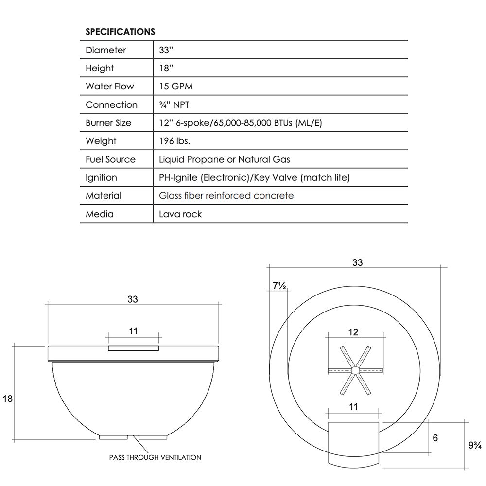 Prism Hardscapes PH-444-FWBCNG Sorrento Concrete Gas Fire and Water Bowl, 33-Inch offers a fine fire and water feature option for your patio paradise or outdoor entertainment space. This piece is crafted from glass fiber reinforced cement that undergoes a custom handcrafted patina finishing process that ensures durability and a high quality appearance that will improve over time. On top of superior craftsmanship, Prism Hardscapes also offers six different color options: Cafe, Coastal, Ebony, Natural, Pewter and Ultra White. Each Prism Hardscapes fire pit includes standard lava rock media, but this can optionally be replaced with fire glass (sold separately). Incorporate this masterpiece into your perfect outdoor living space and enjoy your enhanced atmosphere for years to come.
